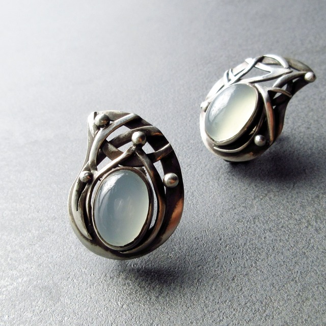 とろりとしたグレー系の色合いをしたカルセドニーのシルバーイヤリングです。 アシンメトリーで、少しふくらみをつけたふっくらとしたカーブ。 大切な時間に、 上品な装いに、 特別なシーンにとても引き立つ一点ものです。 ■天然石について■ カルセドニー 和名は玉髄 クォーツなどと同じ石英のグループ。 穏やかさを感じさせる静かな雰囲気の石です。 ■Beenのシルバーの特徴■ 燻し銀や艶消しの作品がメインです。 燻し銀とは経年を感じさせる重厚感、 そして陰影の美しさや深みを表現するものです。 クラシカルで肌になじみやすい色合いです。 ■詳細■ ・大きさ 23×30mm ・シルバー950製 (100%のうち95%が銀という意味です) 詳しくはこちら http://been.theshop.jp/p/00010 ・イヤリング金具はネジ&クリップ式 (シルバー925・既製品) ・シリコンカバーをお付けしています。 (イヤリングをつけたときに感じる独特な痛みを軽減させます) ・カルセドニーの大きさ 10×14mm ■Beenについて■ 落ち着いた風合いと存在感のあるデザインで 大人の女性に似合うシルバージュエリーを作っています。 一枚の銀板を切って叩いて組み立てていく一点ものの彫金ジュエリーです。 身につけることで、ちょっと元気が出たり 心が浮き立ったり、 自信をもって背筋を伸ばし前に進んでいけるように。 そんな願いを込めてひとつひとつ丁寧に制作しています。 ■ ■ ■ ・ご不明な点がございましたらお問い合わせくださいね ・ご覧になるディスプレイの環境等で色味が異なる場合がございます。 ・特定商取引の表記を必ずご確認ください https://been.theshop.jp/law