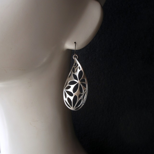 まとめ髪やショートヘアを更にエレガントに。 すこし艶を落としたシックな光。 花モチーフを大人の女性に似合う雰囲気に仕上げました。 ■詳細■ ・シルバー950を使用 ・大きさ 56×24mm (金具含まず) ・重さ、片耳6.3gくらい (詳細■ ・シルバー950を使用 ・大きさ 56×24mm (金具含まず) ・重さ、片耳6.3gくらい (少し重めです・・500円玉が7g) ・ピアス チタン製 ・イヤリング金具の場合はシルバー925の既製品 ◆密封袋での保管をお勧めします 銀のアクセサリーは黒くなります。 ピカピカの銀色を保つのもいいですが 磨いても届かない細かい部分がだんだんと黒くなっていきます。 そして磨ける部分はぴかっと光らせていくと奥行きが出てきます。 これこそが銀ならではの特徴を生かしたもの。 お好きな色合いに育てていくのも銀の楽しみ方です。 ■Beenについて■ 落ち着いた風合いと存在感のあるデザインで 大人の女性に似合うシルバージュエリーを作っています。 一枚の銀板から生み出す一点ものの彫金ジュエリーです。 アクセサリーをつけることででちょっと元気が出たり 背筋を伸ばして進んでいけるように。 そんな願いを込めてひとつひとつ丁寧に制作しています。 ■ ■ ■ ・シルバー950とは http://been.theshop.jp/p/00010 ・ご不明な点がございましたらお問い合わせくださいね ・ご覧になるディスプレイの環境等で色味が異なる場合がございます。 ・特定商取引の表記を必ずご確認ください https://been.theshop.jp/law