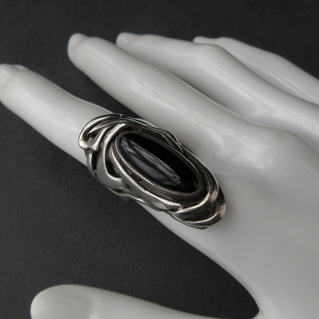 スッキリとした縦長のオニキスを クールな雰囲気に仕上げました。 ■天然石について■ 「オニキス」 オニキスはもともとは黒と白の縞メノウのことを差します。 ただ、日本で真っ黒のものオニキスと呼んで人気が出たため、現在日本では「オニキスといえば真っ黒の瑪瑙」です。 真っ黒の瑪瑙は正式にはブラックカルセドニーという名前です。 ■Beenのシルバーの特徴■ 燻し銀や艶消しの作品がメインです。 燻し銀とは経年を感じさせる重厚感、 そして陰影の美しさや深みを表現するものです。 クラシカルで肌になじみやすい色合いです。 ■Beenについて■ 落ち着いた風合いと存在感のあるデザインで 大人の女性に似合うシルバージュエリーを作っています。 一枚の銀板を切って叩いて組み立てていく一点ものの彫金ジュエリーです。 身につけることで、ちょっと元気が出たり 心が浮き立ったり、 自信をもって背筋を伸ばし前に進んでいけるように。 そんな願いを込めてひとつひとつ丁寧に制作しています。 ■詳細■ ・オニキス大きさ 22×8mm ・全体大きさ 40mm ・サイズ 11号 (サイズ直しできません) ・シルバー950を使用 (100%のうち95%が銀という意味です) 詳しくはこちら http://been.theshop.jp/p/00010 ■ ■ ■ ・ご不明な点がございましたらお問い合わせくださいね ・ご覧になるディスプレイの環境等で色味が異なる場合がございます。 ・特定商取引の表記を必ずご確認ください https://been.theshop.jp/law
