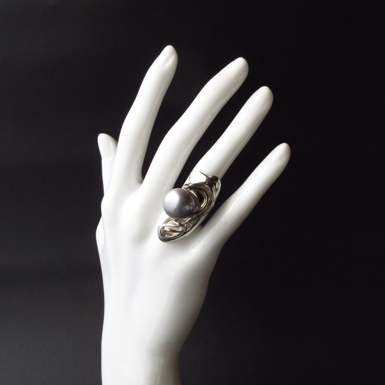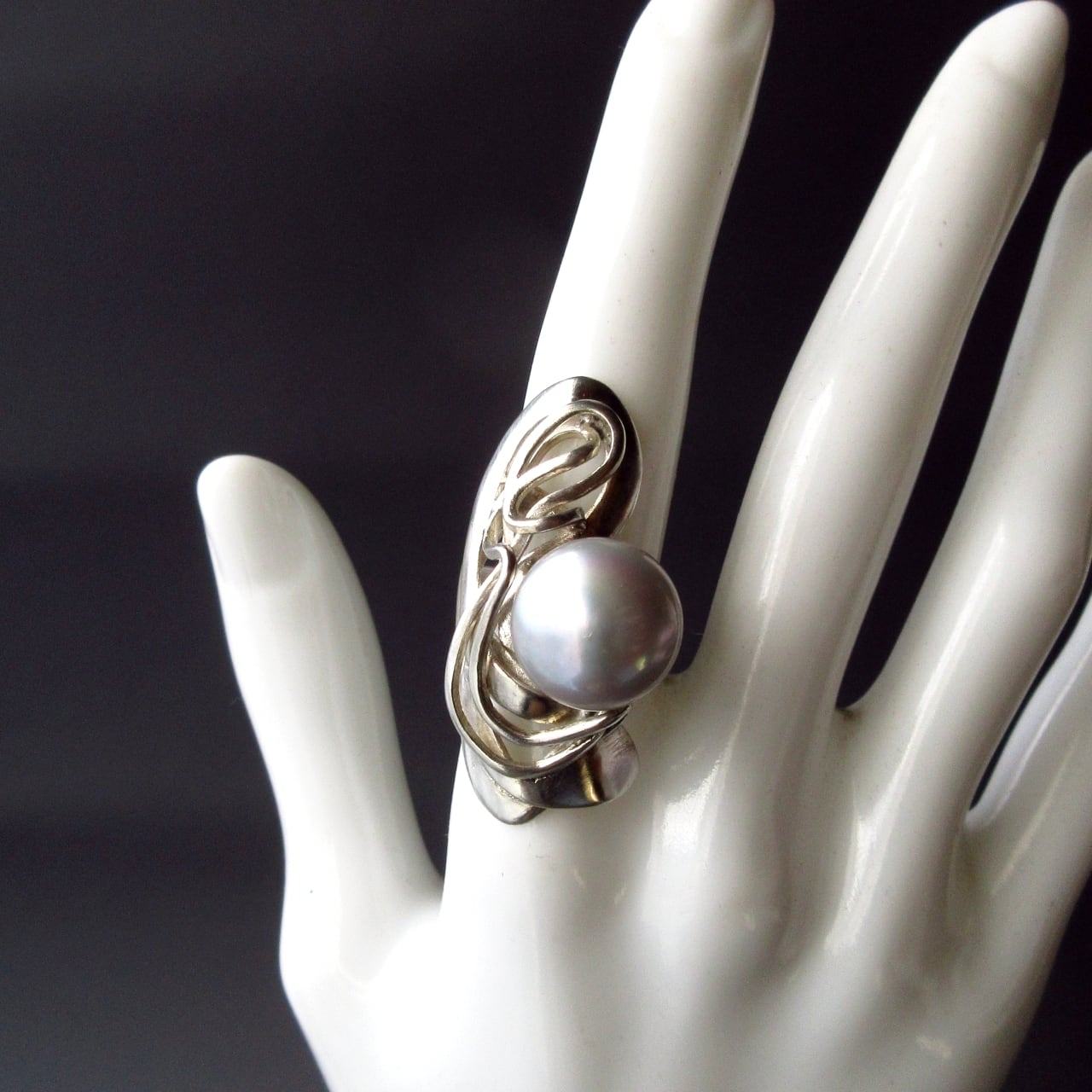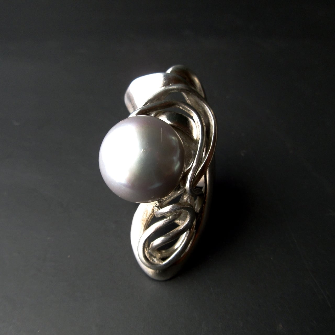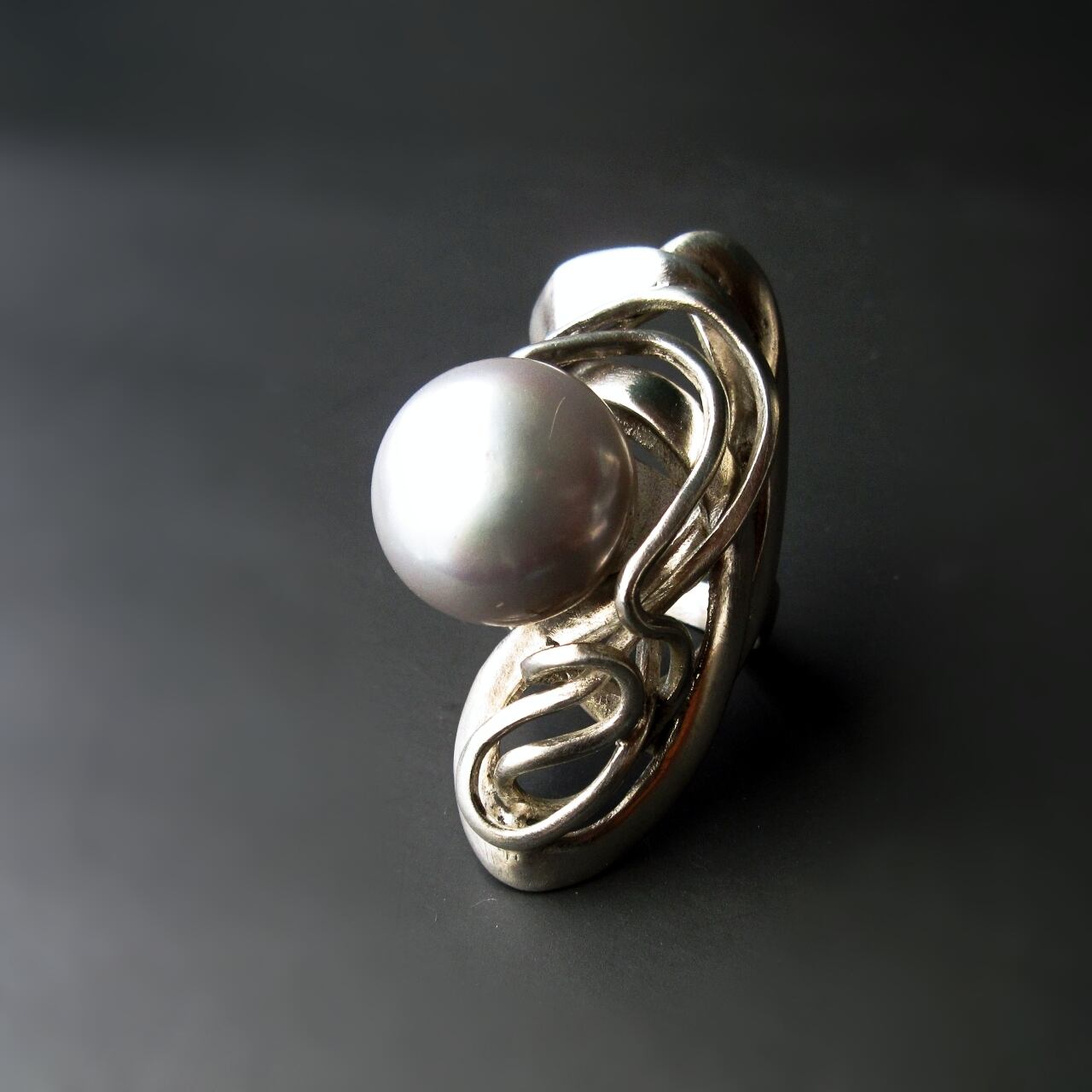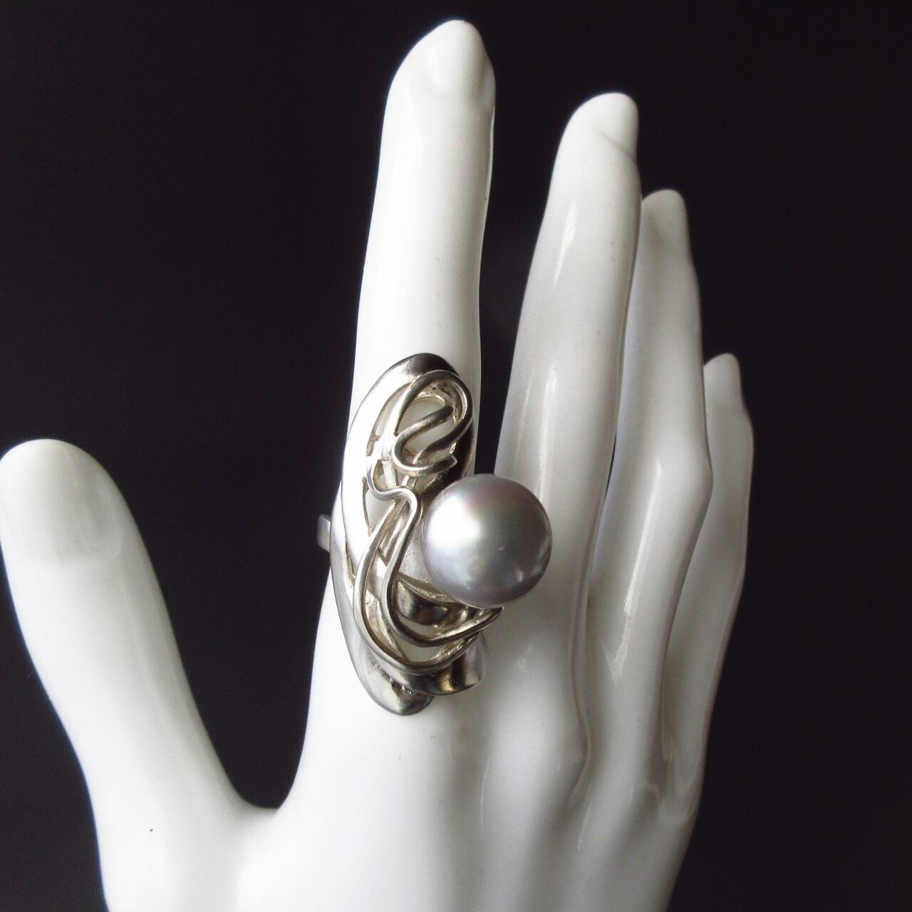 大粒の淡水パールをコロンとのせた幅広のシルバーリングです。