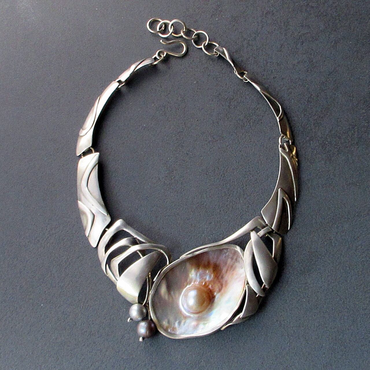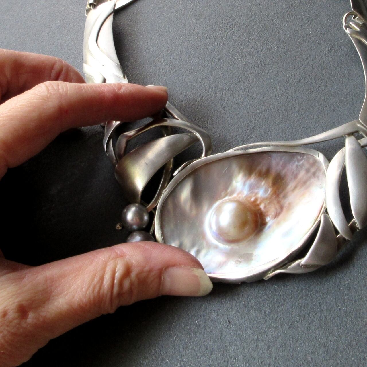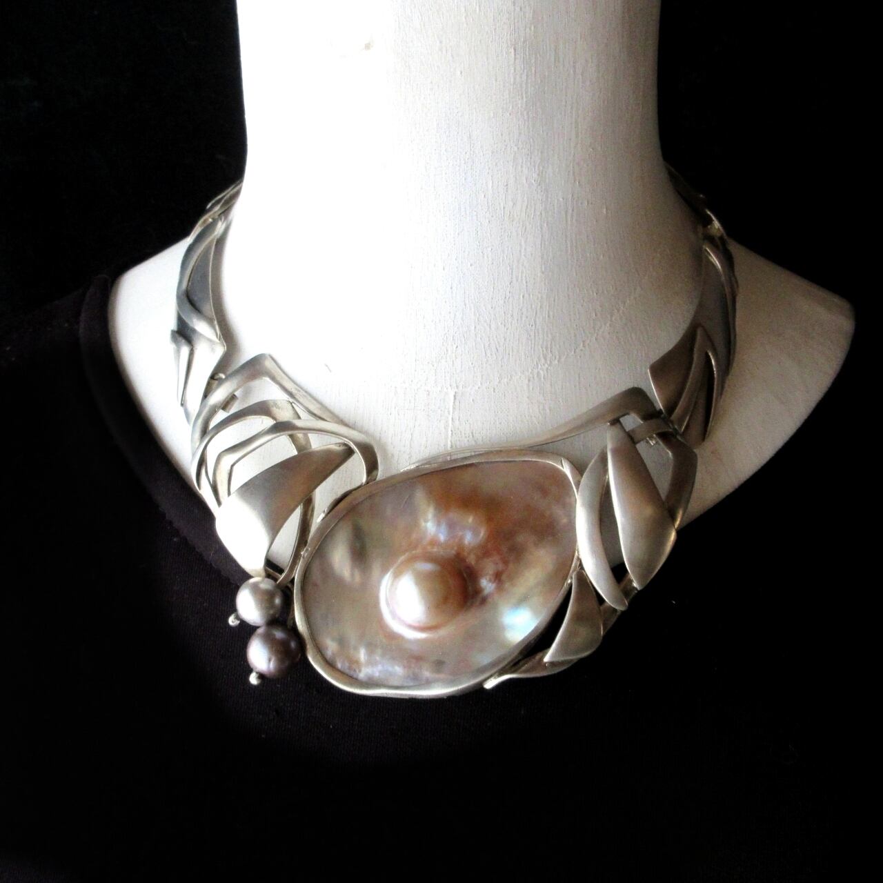 3種類の色味が異なるパールを使って重厚感のあるシルバーチョーカーに仕上げました。