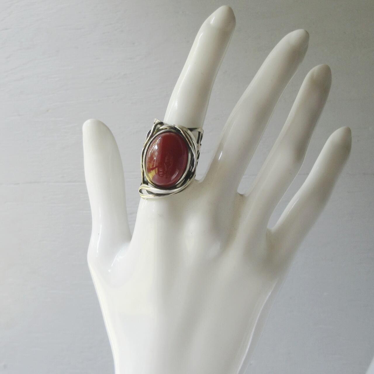 その赤色に合うように、いぶし銀の加工をほどこした力強い印象のリングです。
